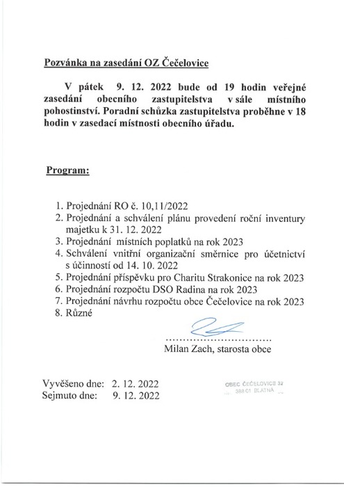 Pozvánka na veřejné zasedání OZ obce Čečelovice 9.12. 2022