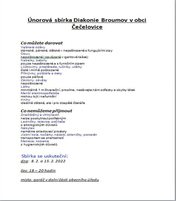 Úvod > O obci > Aktuality > Únorová sbírka Diakonie Broumov v obci Čečelovice