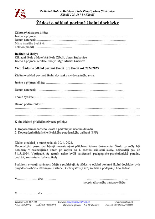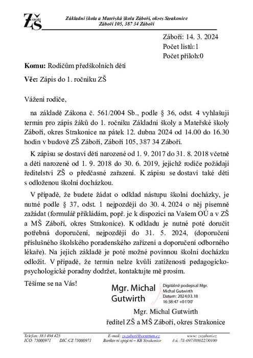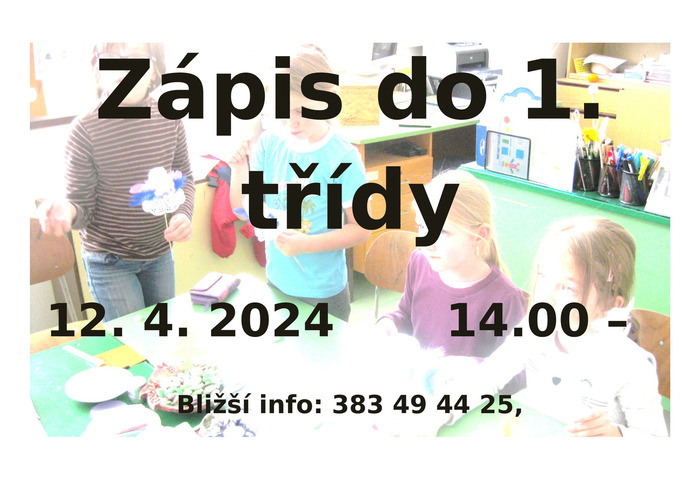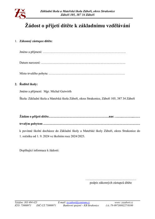 V pátek 12. dubna 2024 proběhne v budově ZŠ Záboří od 14.00 do 16.30 hodin zápis do ZŠ a MŠ Záboří. Dokumenty, které mají mít zákonní zástupci s sebou, naleznete v příloze.
